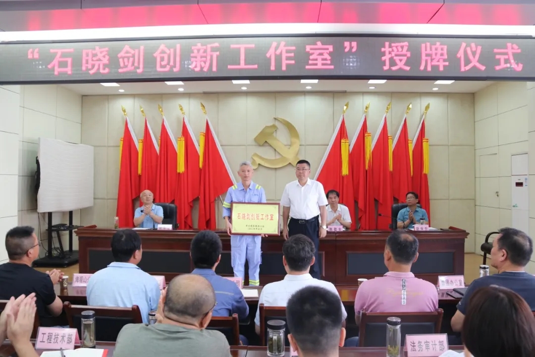 三樓會(huì)議室座無虛席,公司領(lǐng)導(dǎo)班子,機(jī)關(guān)部室負(fù)責(zé)人、基層單位分管領(lǐng)導(dǎo)及技術(shù)骨干、職工代表等40余人共同見證授牌時(shí)刻。湖北省首席工人技師、公司首席電氣工程師石曉劍進(jìn)行表態(tài)發(fā)言,公司黨委書記、董事長、總經(jīng)理余曦親自將“石曉劍創(chuàng)新工作室”銅牌頒授到石曉劍手上。